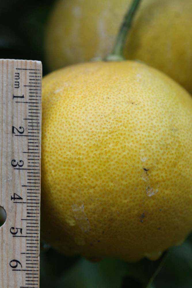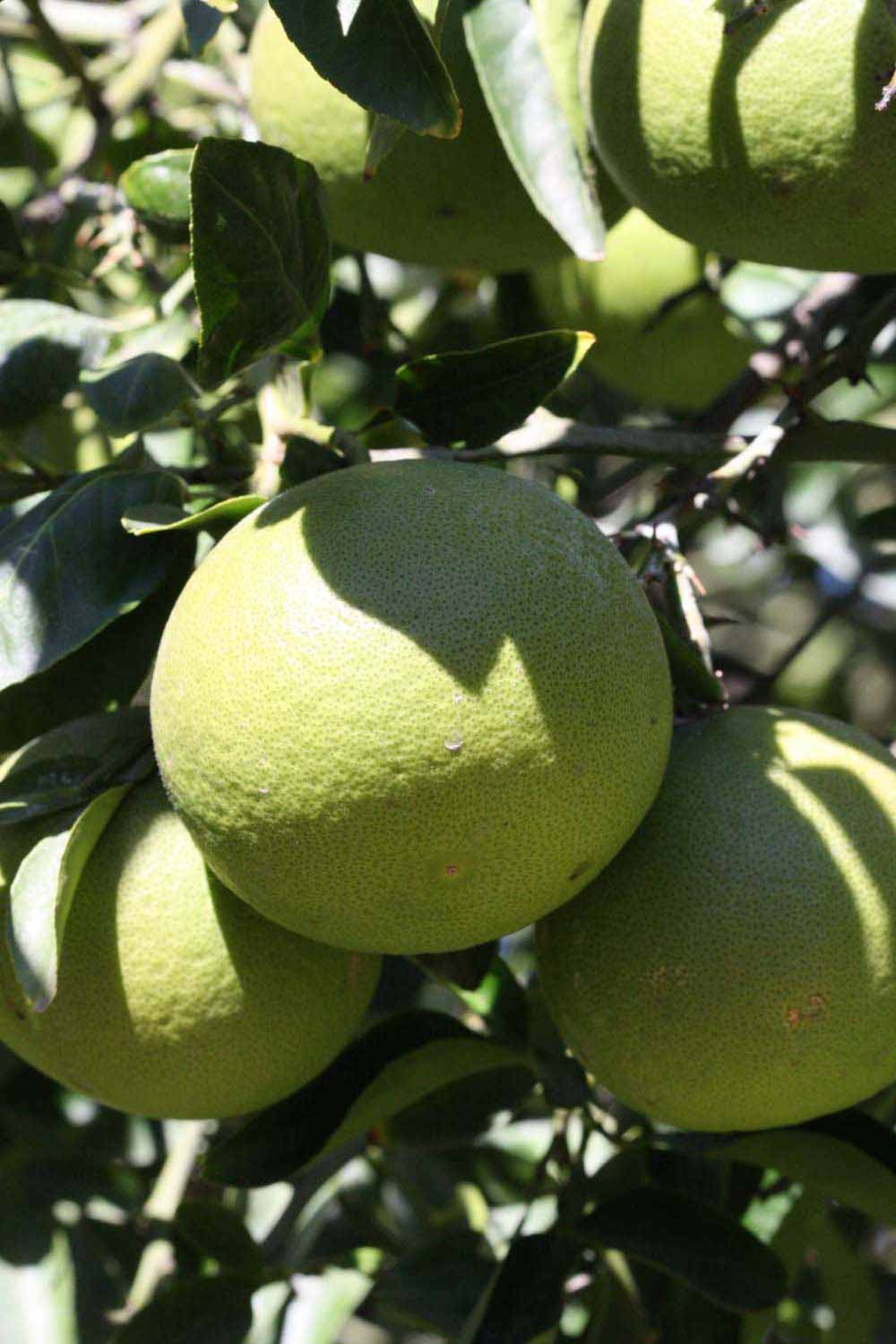 Crown compact or dense, not weeping. First-year twig surface glabrous or pubescent; second- or third-year twig surface striate; thorns straight; prickles absent or not persistent. Petiole pubescent, length long or very long, wings medium or wide, adjoining the blade. Leaflets one or three, margin bluntly toothed, shade leaflet blades weakly conduplicate, sun leaflet blades flat or weakly conduplicate. Scent of crushed leaflets sweetly orange-like. Fruit as broad as long or longer than broad; rind yellow (7-10) or yellow-orange (11); rind texture slightly rough (4-5); firmness leathery; navel absent; flesh orange or yellow; taste grapefruit-like or sour.