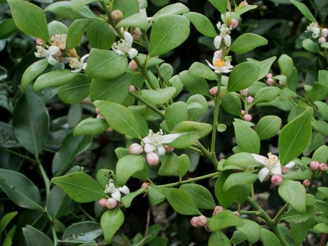 该品种是一种高2米,宽1米的浓密的中等灌木。枝梢叶腋单生枝刺,约25毫米长;叶小而窄,单叶,倒卵形到椭圆形,无毛,新叶浅绿色;花白色(花蕾带粉红色),直径约10-15mm,花期8 - 9月;果实为圆筒形浆果,长4-8厘米,直径15-25毫米,果皮绿中带褐色,囊胞深粉红色,易于提取。“布隆戈比亚” Blunobia是默威伦巴Murwillumbah的布瑞尔Burrell山的一个农场的名字,创始人吉姆Jim和芭芭拉•奥布莱恩Barbara O’Brien住在那里。1988年首次引进,2007年2月1日被接受注册。